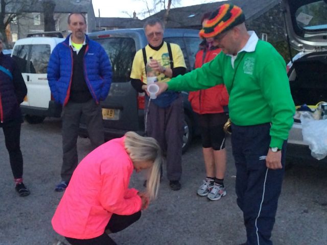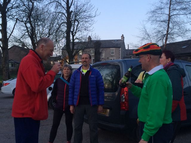 This r*n started well because most of us arrived early enough to have a pint in the on inn before setting off. We set off across the moorland slopes below the Howgills. Fortunately it was fine and bright because the hare seemed to use so little flour that we thought if we had collected it we could not have made a decent dumpling or a small cupcake. The hare rounded us up (with his dogs) bfore we reached Newbiggin on lune and directed us on the right road. The hare was given a downdown for a good r*n and another for leaving his belt pack in the buckets aftr the last time he hashed. Bone idle was christened with that name because she seemed to be doing everything. The On Inn provided a good meal for everyone and the beer was good as well.